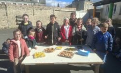 La classe des maternelles a réalisé des poissons feuilletés au chocolat, tandis que les plus grands ont épluché, coupé et assemblé les fruits (kiwis, oranges, pommes) pour former des brochettes. Joyeux anniversaire à tous les cuisiniers !
