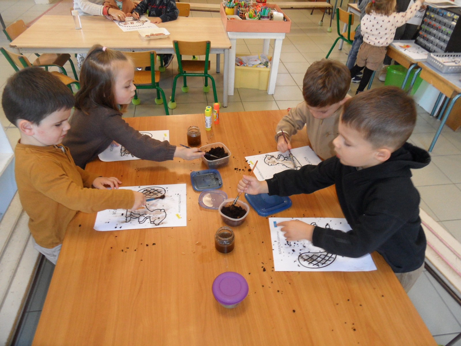 Nous avons utilisé du marc de café pour donner la couleur marron à notre castor. On a remarqué que ça sentait comme chez les papas et mamans le matin !