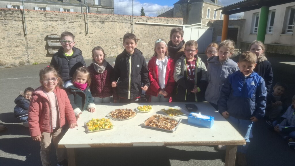 La classe des maternelles a réalisé des poissons feuilletés au chocolat, tandis que les plus grands ont épluché, coupé et assemblé les fruits (kiwis, oranges, pommes) pour former des brochettes.
