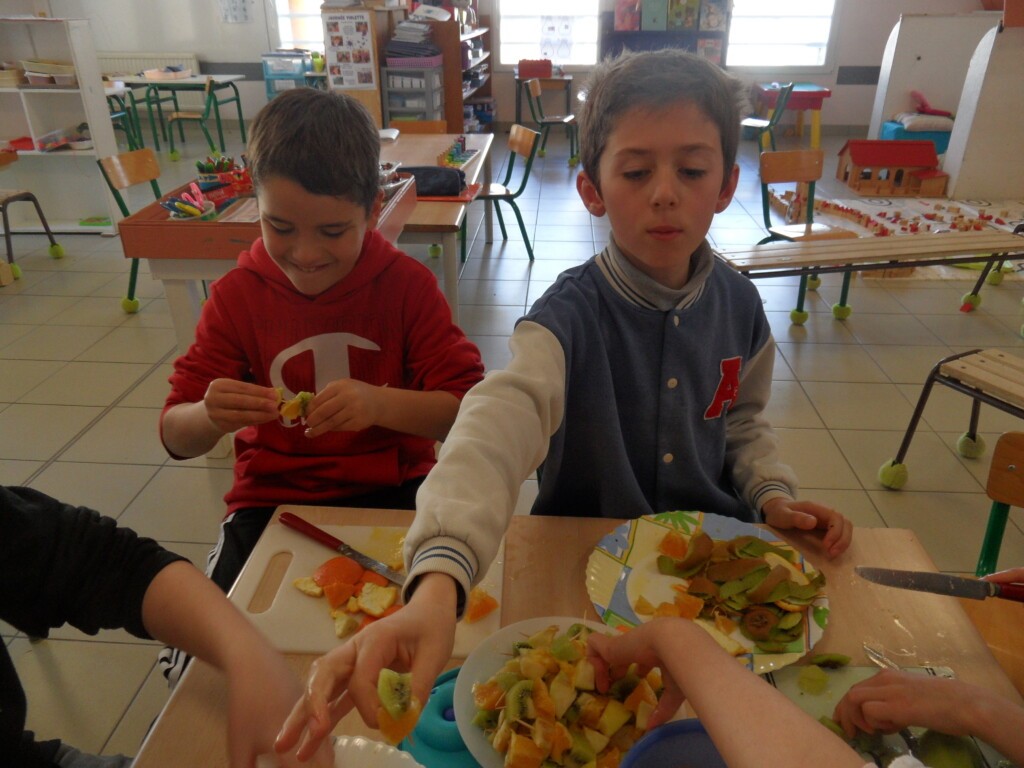 La classe des maternelles a réalisé des poissons feuilletés au chocolat, tandis que les plus grands ont épluché, coupé et assemblé les fruits (kiwis, oranges, pommes) pour former des brochettes.